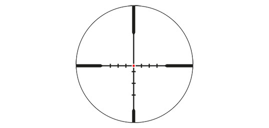 Magnification1-4xObjective Lens Diameter24 mmFocal PlaneSecond Focal PlaneReticleIlluminated Dead-Hold® 2A BDC (MOA)Eye Relief3.8"Field of View109.5' - 26.7' @ 100 yds.Turret StyleCappedTube Size30mmAdjustment Graduation1/2 MOATravel Per Rotation30 MOAMax Elevation Adjustment130 MOAMax Windage Adjustment130 MOAParallax Setting100 yds.Length9.5"Weight15.3 oz.